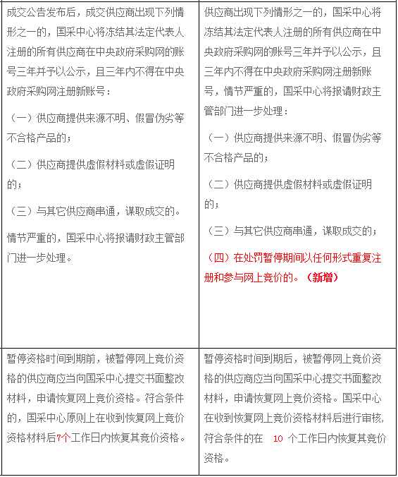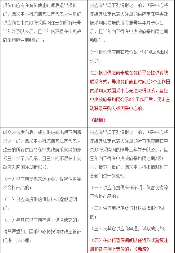 第三十条 供应商出现下列情形之一的,国采中心将冻结其法定代表人注册的所有供应商在中央政府采购网的账号三年并予以公示,且三年内不得在中央政府采购网注册新账号,情节严重的,国采中心将报请财政主管部门进一步处理: