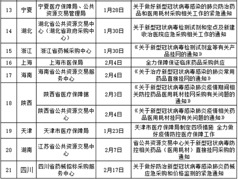 自新型冠状病毒感染的肺炎疫情爆发以来,1月23日,湖北省中心紧急挂网采购防控药品药械,及时满足各地医疗卫生机构疫情防控应急需求。据统计,自1月22日至2月17日以来,有20多个省级交易平台、医保部门出台相关制度及措施,执行药品及医用耗材应急采购机制。